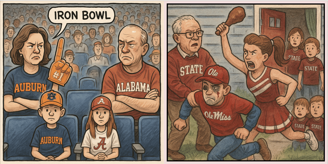 It’s why families intentionally sit on opposite sides of the aisle at the Iron Bowl. It’s why your uppity Ole Miss uncle storms out of Thanksgiving dinner with a black eye—after telling your aunt, the former Mississippi State cheerleader, that Jaxon Dart was better than Dak Prescott.