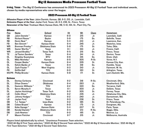Notably, individual awards were presented to players who have shown outstanding performances. Jalon Daniels, the dynamic quarterback from Kansas, has been honored with the Offensive Player of the Year award for his remarkable abilities and leadership on the field.